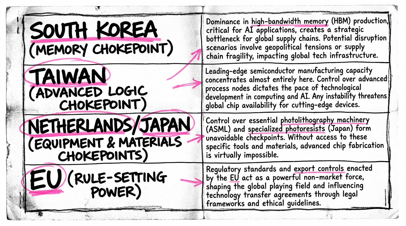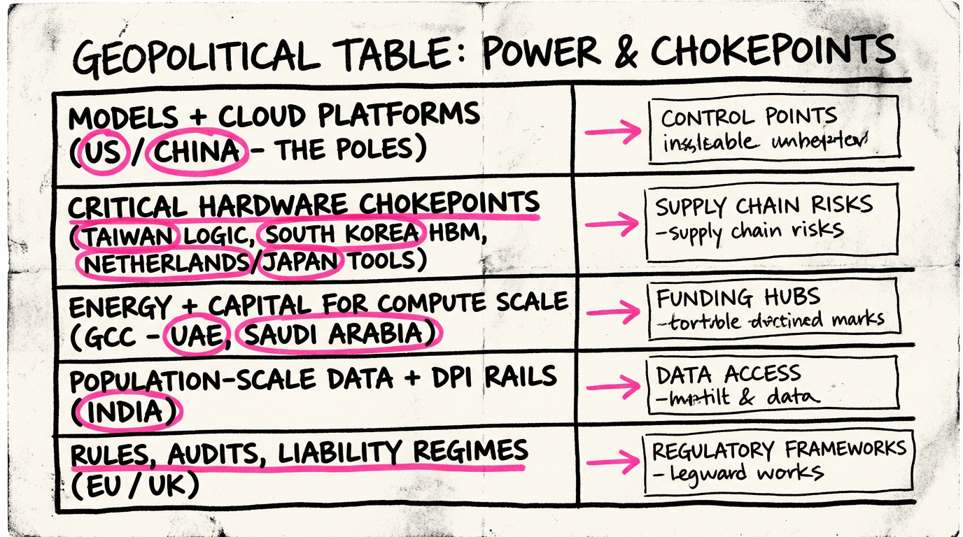 - Middle East compute constraints: Capital and energy don't guarantee success without deep technical talent and procurement access. Test: Can UAE sustain frontier training runs independently, or do partnerships keep core IP abroad?