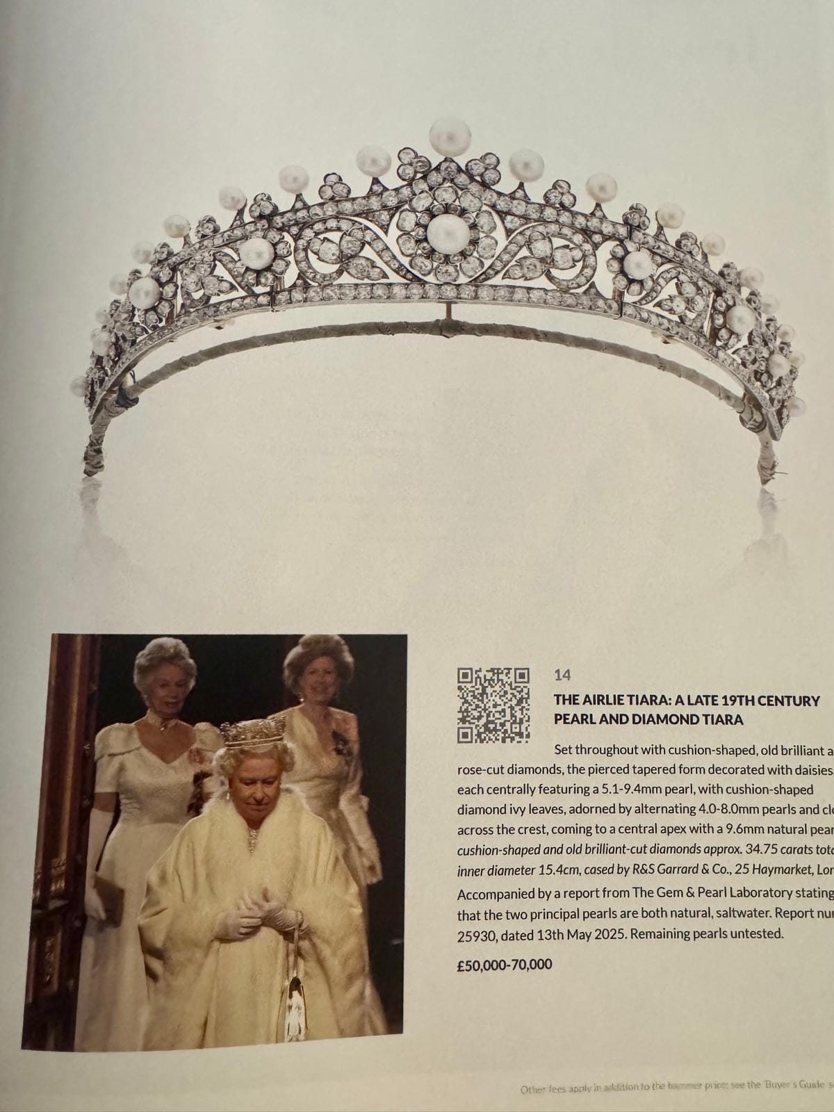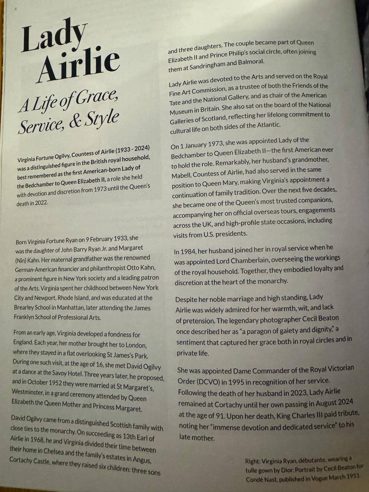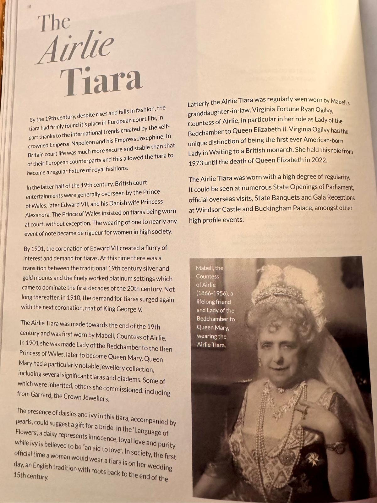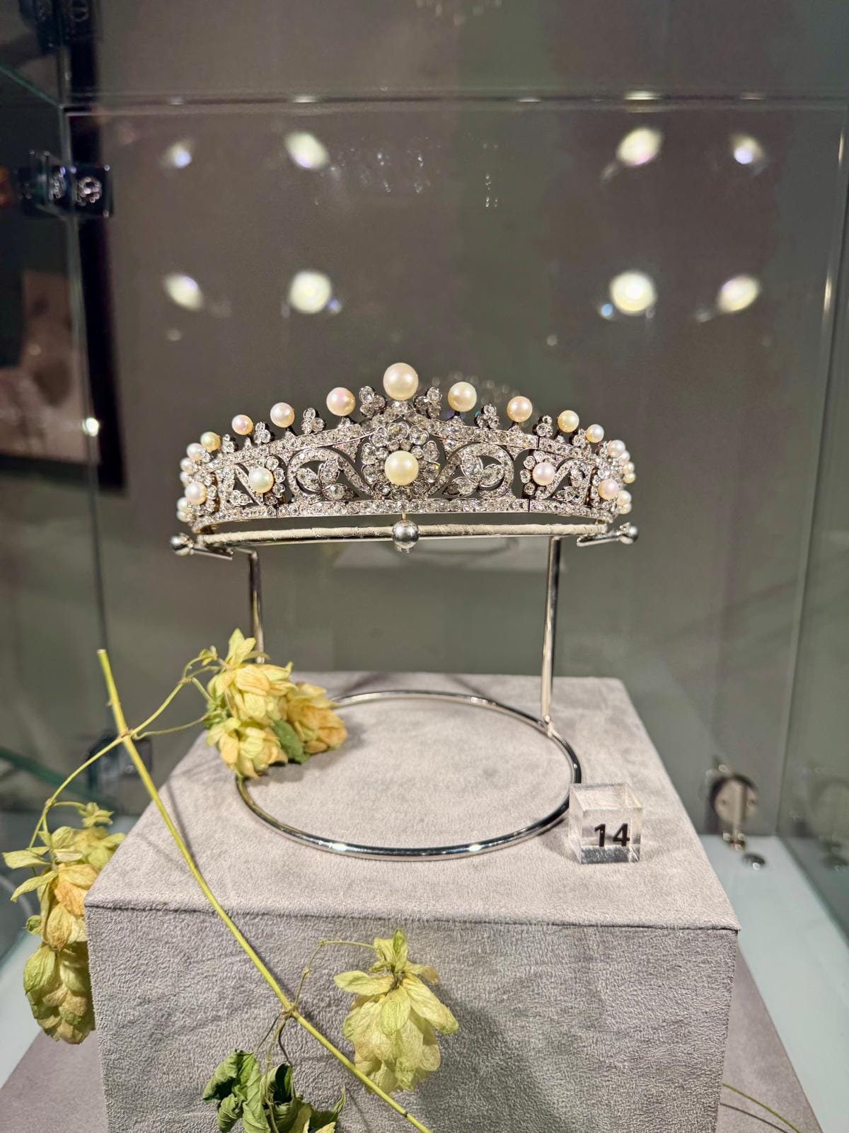 Among them, one object drew me in completely — the tiara of the Countess of Airlie. A life of grace, service, and style seemed distilled into this single piece. The Countess, the first American-born Lady of the Bedchamber to Queen Elizabeth II, served with devotion from 1973 until the Queen’s passing in 2022. To stand before her tiara — knowing it once accompanied moments of profound intimacy and duty at the heart of British history — felt like brushing against living legacy.