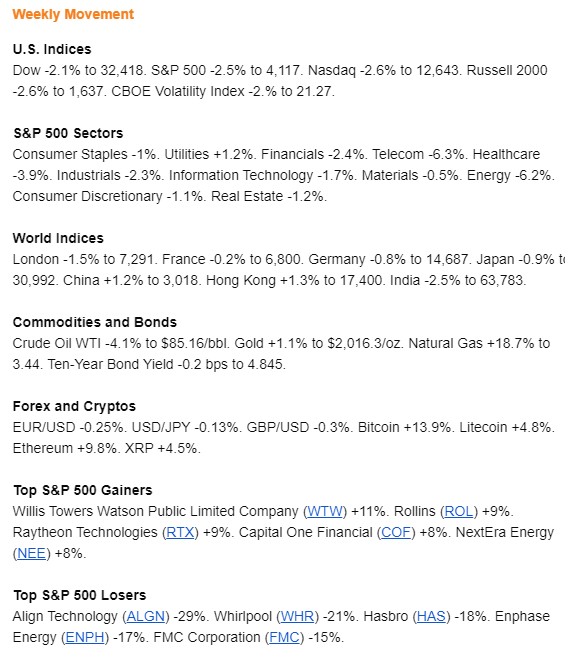 - Stock Market Performance: U.S. stock indices dropped for the second week as mixed corporate earnings and higher interest rate fears dented market sentiment. Dow -2.1% to 32,418. S&P 500 -2.5% to 4,117. Nasdaq -2.6% to 12,643. Russell 2000 -2.6% to 1,637. CBOE Volatility Index -2.% to 21.27.