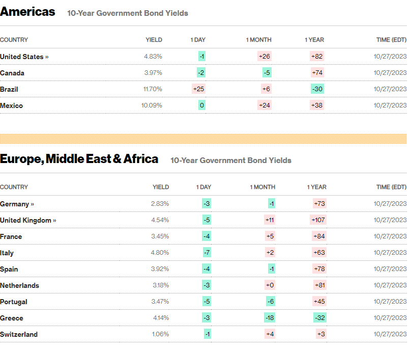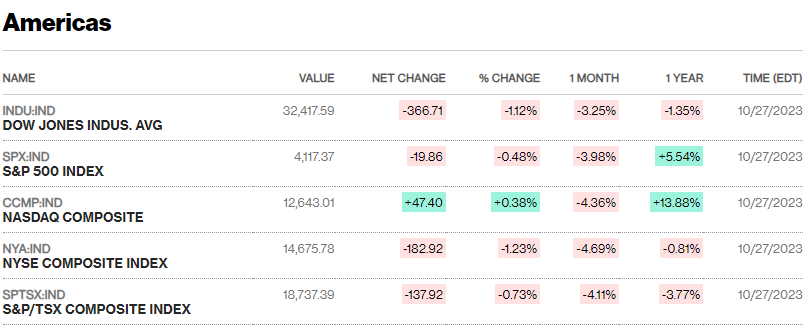 🏈 Bottom Line: U.S. stock benchmarks declined for a second week due to mixed tech earnings and higher interest rate concerns, although the economy showed robust Q3 growth; mixed inflation signals persist but no rate change is expected in the upcoming Federal Reserve policy meeting, amidst a cautious bond market scenario with the 10-year U.S. Treasury yield retreating from the 5% level.