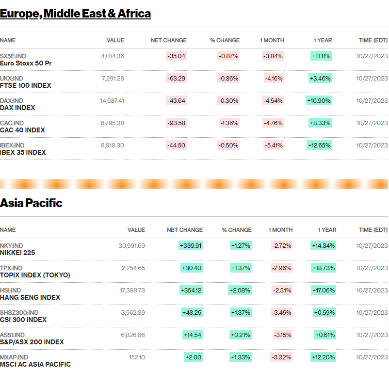 - Stock Index Decline: European stock indexes experienced a decline with the STOXX Europe 600 Index falling by 0.96% due to uncertainties surrounding interest rates, the economy, and Middle Eastern conflicts. Germany’s DAX (-0.75%), France’s CAC 40 (-0.31%), Italy’s FTSE MIB (-0.25%), and the UK’s FTSE 100 (- 1.50%).