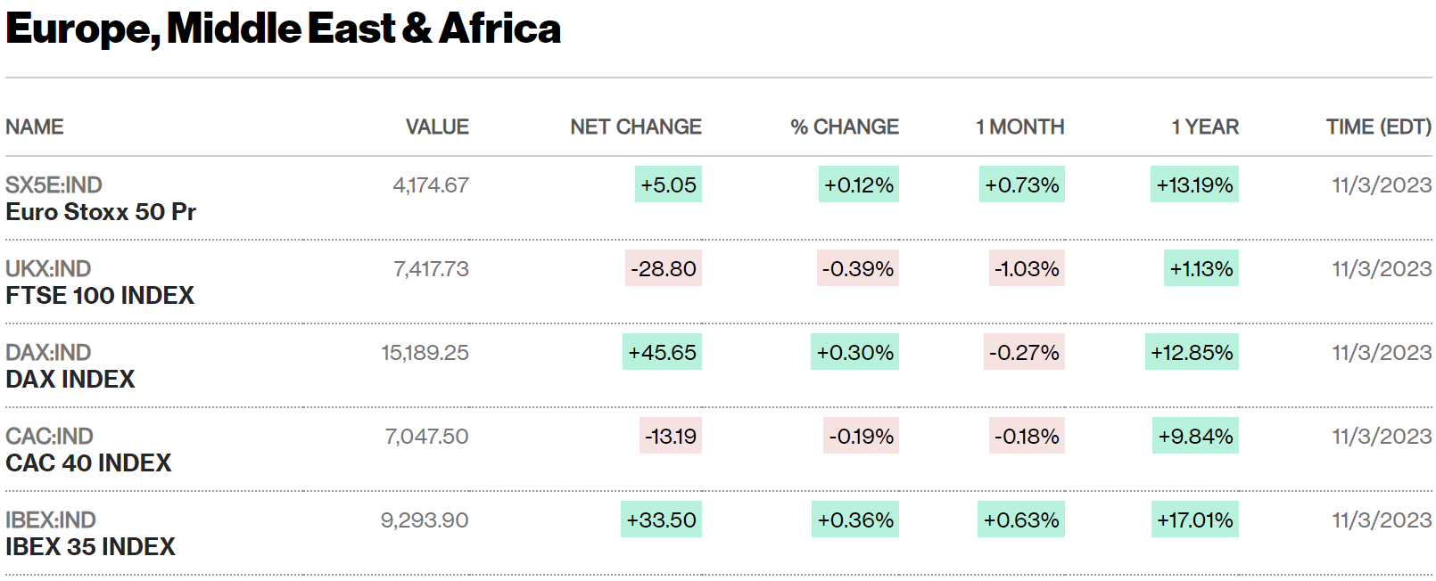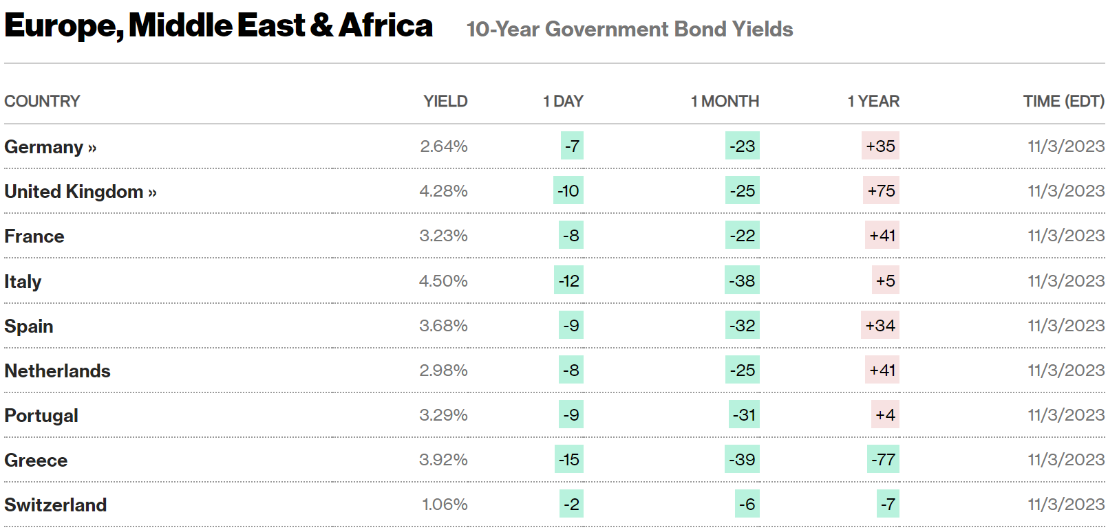 🏈 Bottom Line: The STOXX Europe 600 Index saw a significant recovery, rising by 3.41%, amidst investor expectations that central banks might pause interest rate hikes. European bond yields, including the 10-year German bond which hit a two-month low, fell amid growing expectations that central banks might halt their cycle of monetary policy tightening. French and Swiss 10-yr yields followed suit.