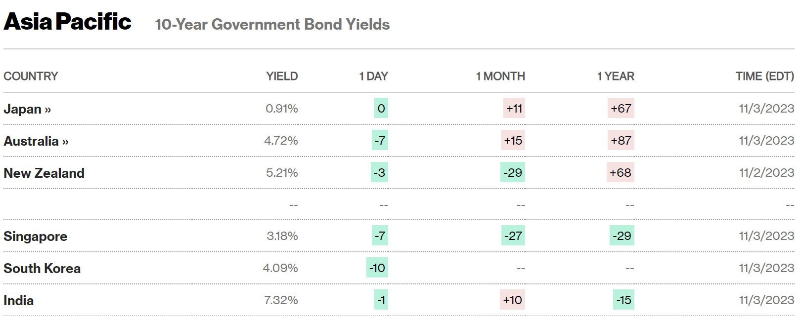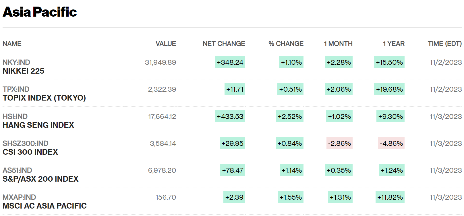 🏈 Bottom Line: Despite China's economic challenges, stock indices rose with the Shanghai Composite up by 0.43%, CSI 300 by 0.61%, and Hong Kong’s Hang Seng by 1.53%, on speculation of a peak in U.S. interest rates.