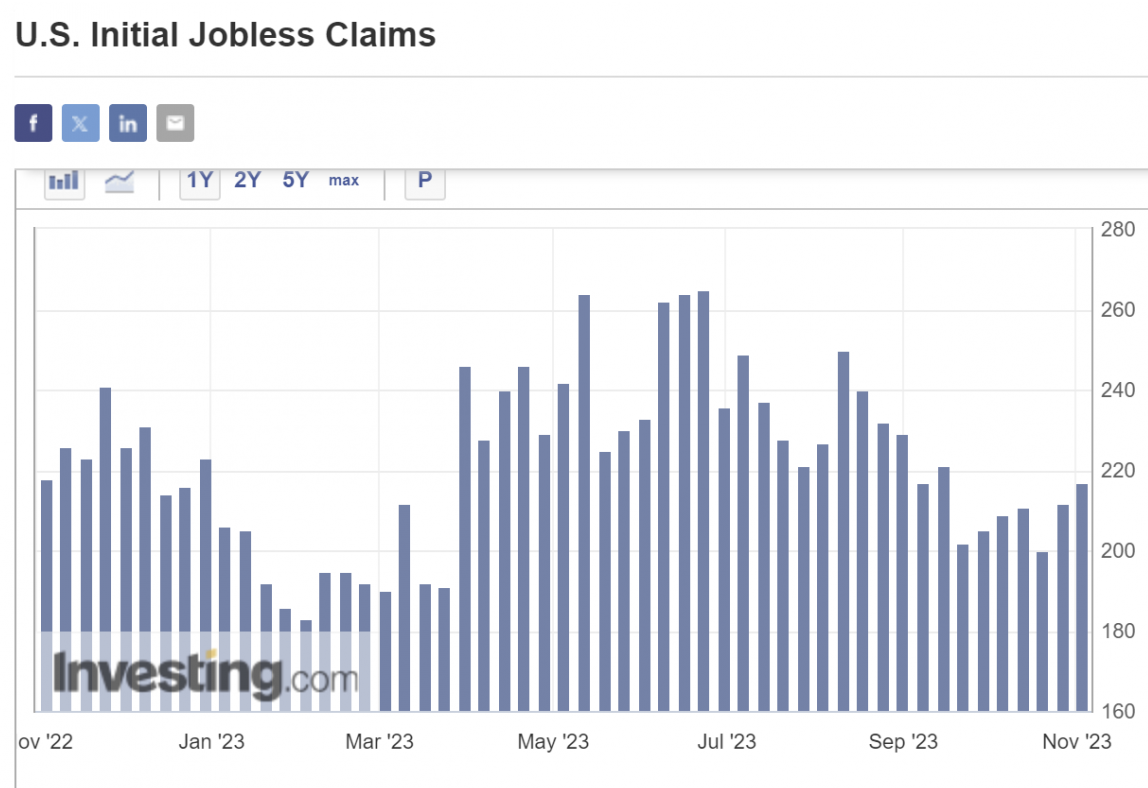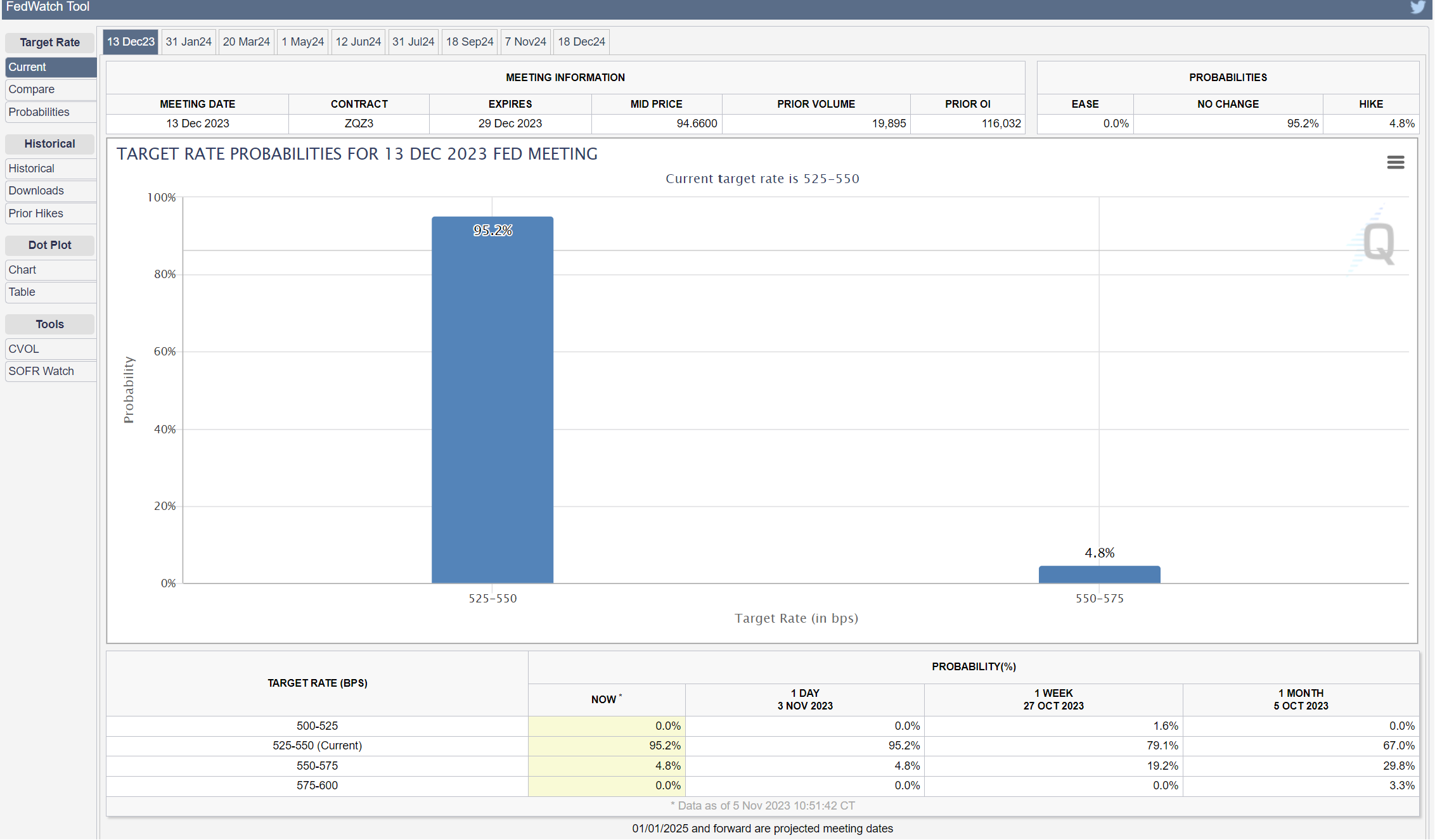 Futures markets for federal funds persist in the expectation that the present target rate range of 5.25% to 5.50% will represent the peak for this cycle. There is a 95.2% chance, as indicated by market pricing, that the central bank will maintain the current interest rates at the forthcoming FOMC meeting on December 13th.
