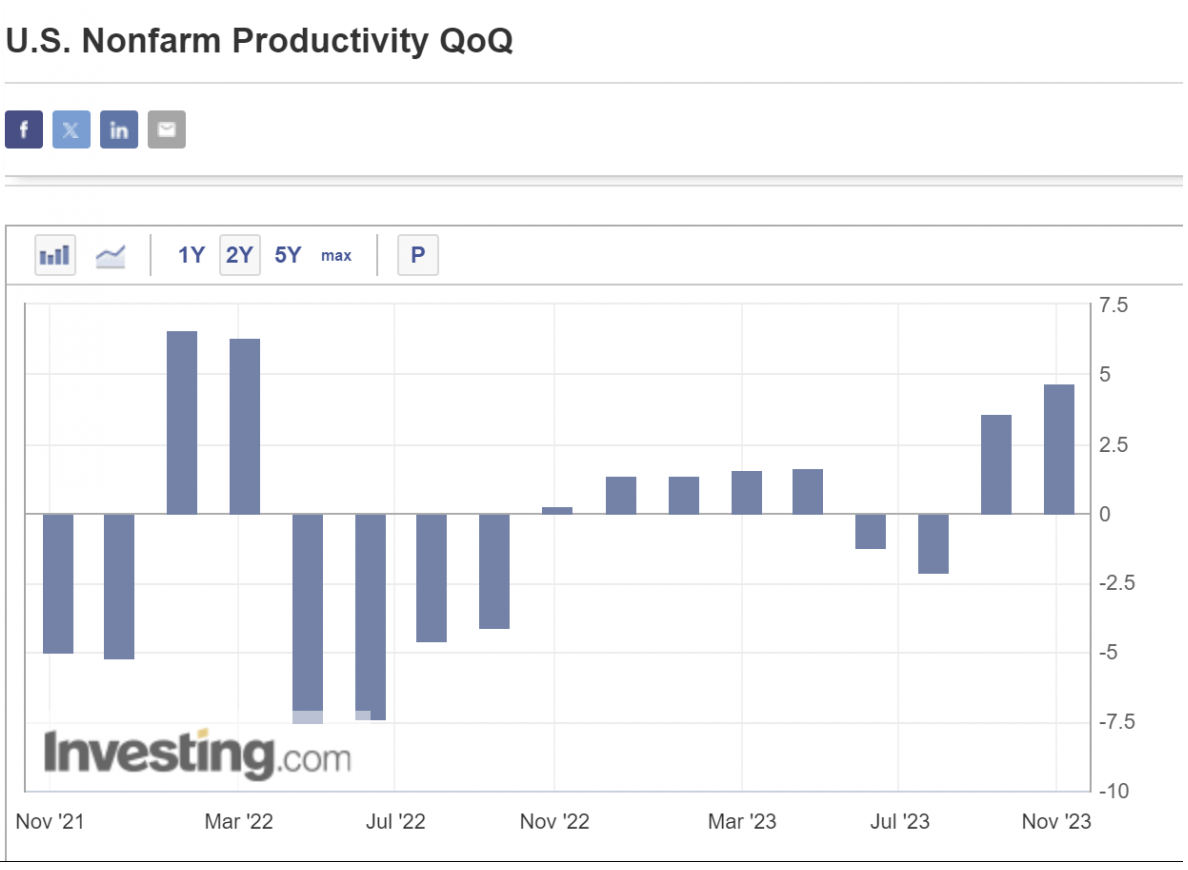- Productivity and Wage Trends: Preliminary estimates showed a 4.7% increase in productivity, the highest since the initial stages of the pandemic reopening, indicating a positive trend for economic efficiency. Despite a modest uptick in the employment cost index, the growth in average hourly earnings decelerated, potentially easing inflationary pressures.