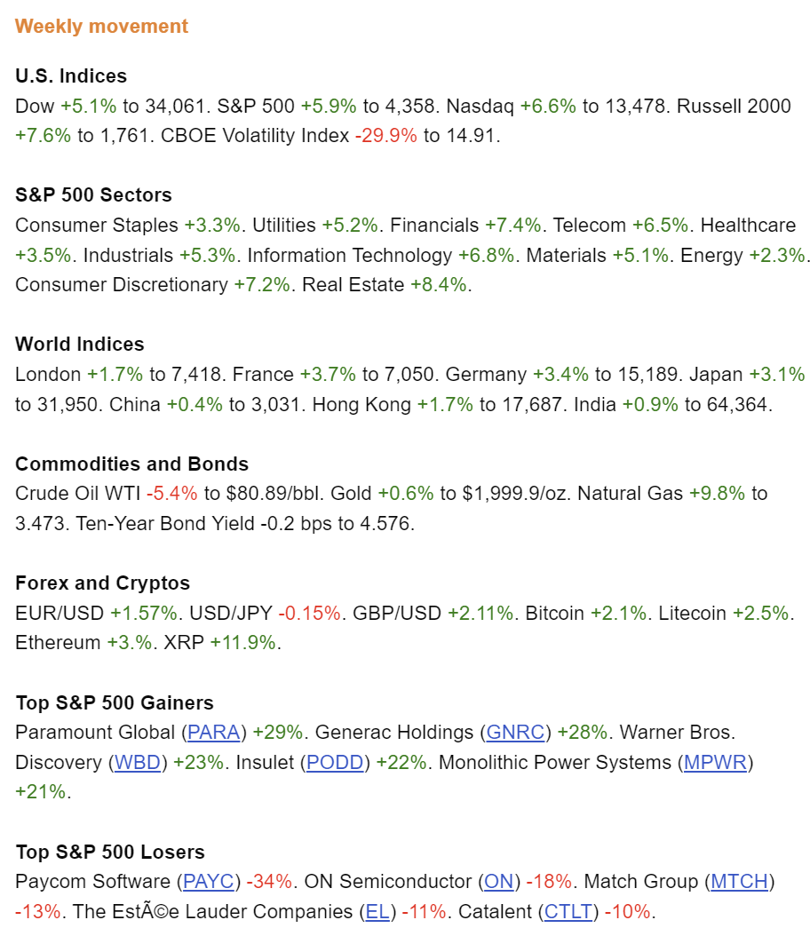 🏈 Bottom Line: S&P 500 saw its best weekly gain since November 2022, on the back of a slowing economy, dovish FOMC statements, and decreasing long-term bond yields. The rally was broad-based, with notable performance from growth stocks, the Nasdaq, and particularly the small-cap Russell 2000. Dow +5.1% to 34,061. S&P 500 +5.9% to 4,358. Nasdaq +6.6% to 13,478. Russell 2000 +7.6% to 1,761.