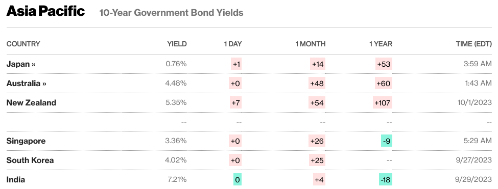- European Government Bonds: European government bond yields increased broadly due to concerns about higher interest rates. Germany's 10-year government bond yield rose to nearly 3%, a level not seen in over a decade. Italian bond yields also advanced on concerns of increased debt issuance to finance a larger deficit. In the UK, the yield on the benchmark 10-year bond climbed above 4.5% before retreating slightly.
