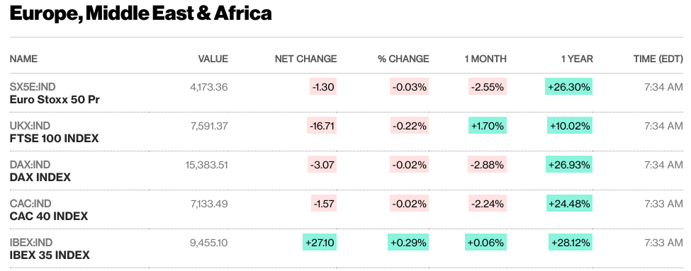 - European stock markets, including the STOXX Europe 600 Index, declined due to concerns about prolonged higher interest rates and a weakening Chinese economy. France's CAC 40 (-0.69%), Germany's DAX (-1.10%), Italy's FTSE MIB (-1.16%), and the UK's FTSE 100 (-0.99%).