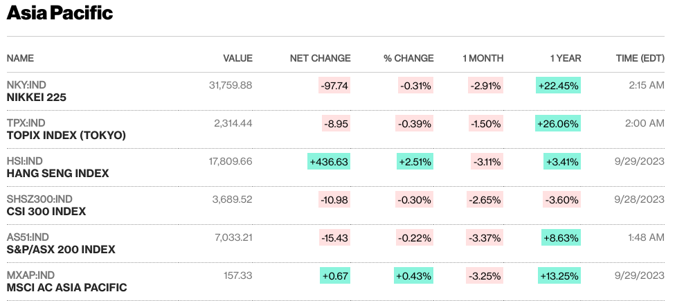 🏈Bottom line: Chinese stocks experienced a decline during a holiday-shortened week, marked by a lack of positive economic news that dampened investor sentiment. Both the CSI 300 Index and Shanghai Composite Index saw losses, while the Hang Seng Index in Hong Kong also fell. However, a private survey indicating price recovery in China eased concerns of prolonged deflation, with the all-sector price index reaching a 14-month high in September. This suggests a more positive outlook for Chinese economic growth and a potential bottoming out of the economy following a post-lockdown recovery in the first quarter.