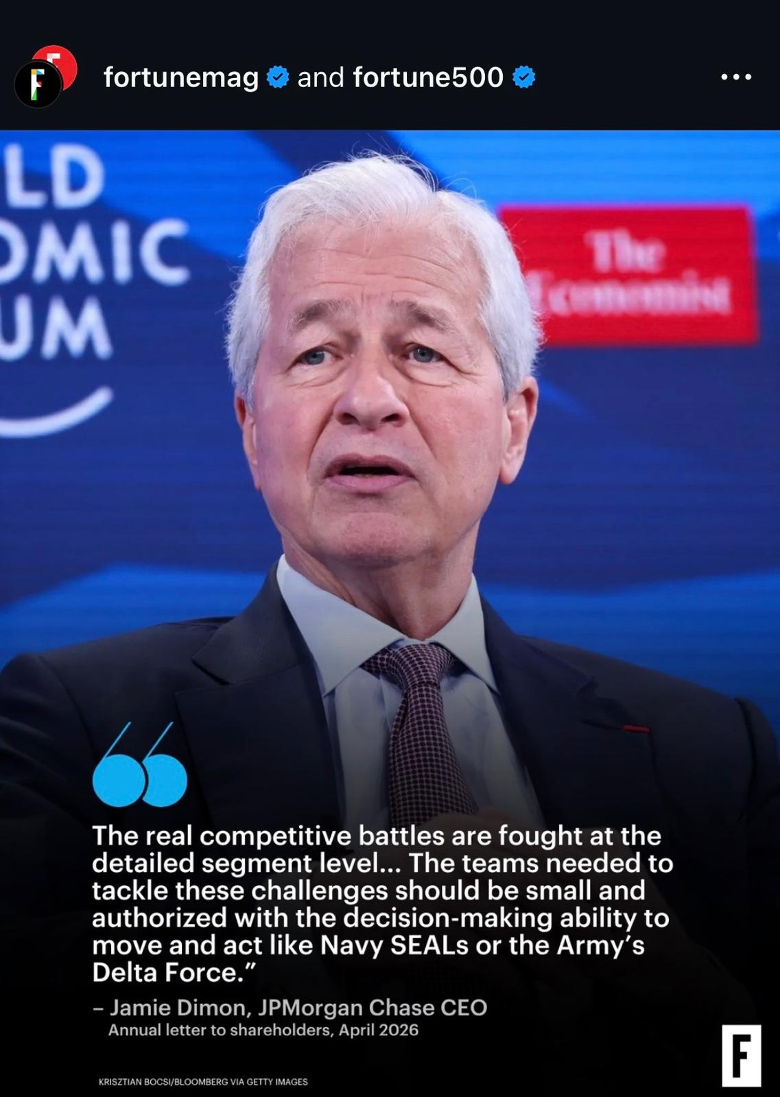 "The real competitive battles are fought at the detailed segment level...The teams needed to tackle these challenges should be small and authorized with the decision-making ability to move and act like Navy SEALs or the Army's Delta Force." - Jamie Dimon