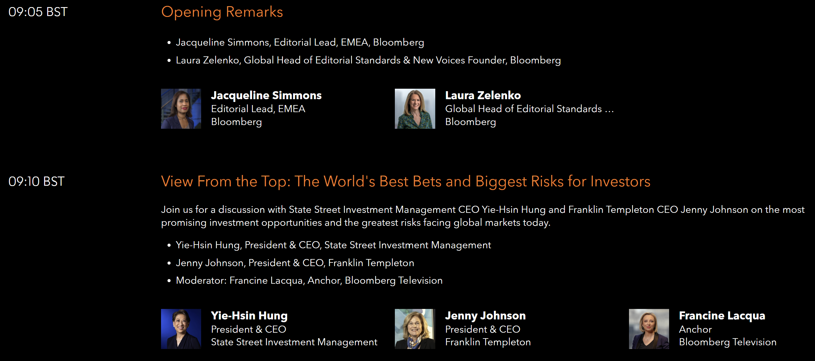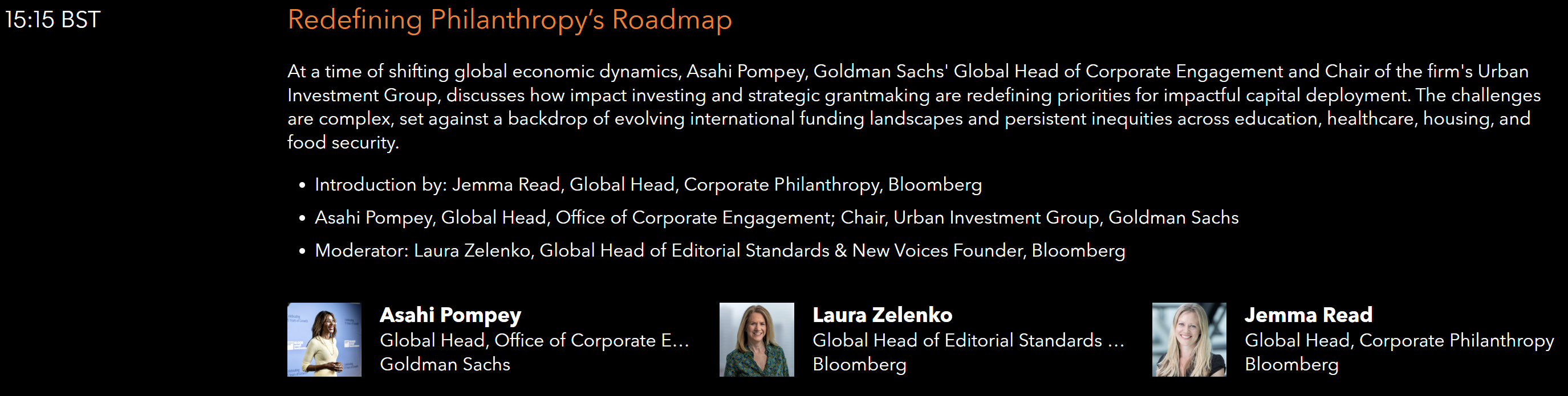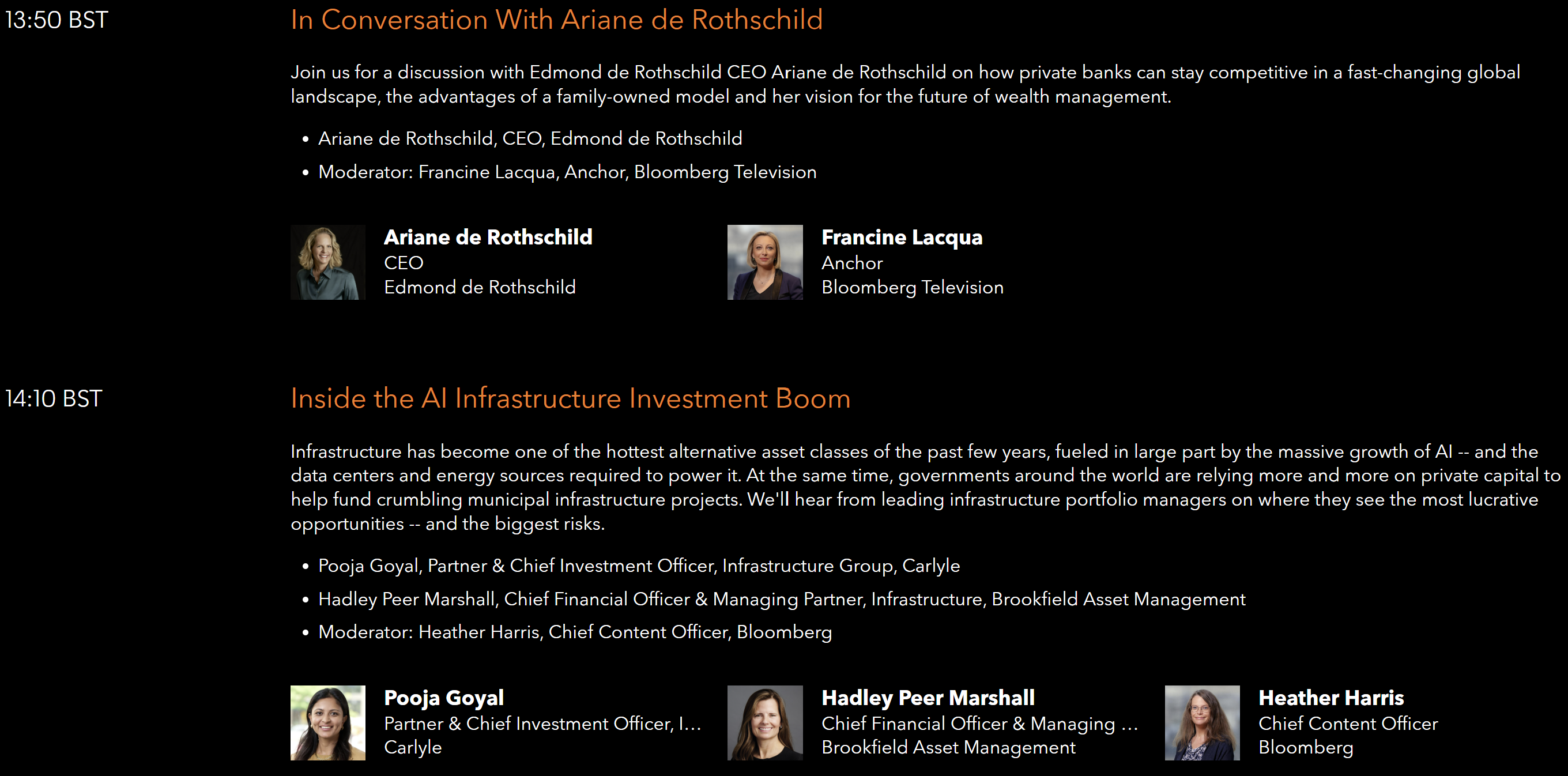 Bloomberg Women, Money & Power 2025—AI, sustainable investing, private markets, M&A, women’s wealth and leadership. Insights from Google, Apollo, State Street, Franklin Templeton, JP Morgan, Goldman Sachs, PIMCO, Blackstone, Brown and Northwestern Endowments, Edmond de Rothschild, etc.