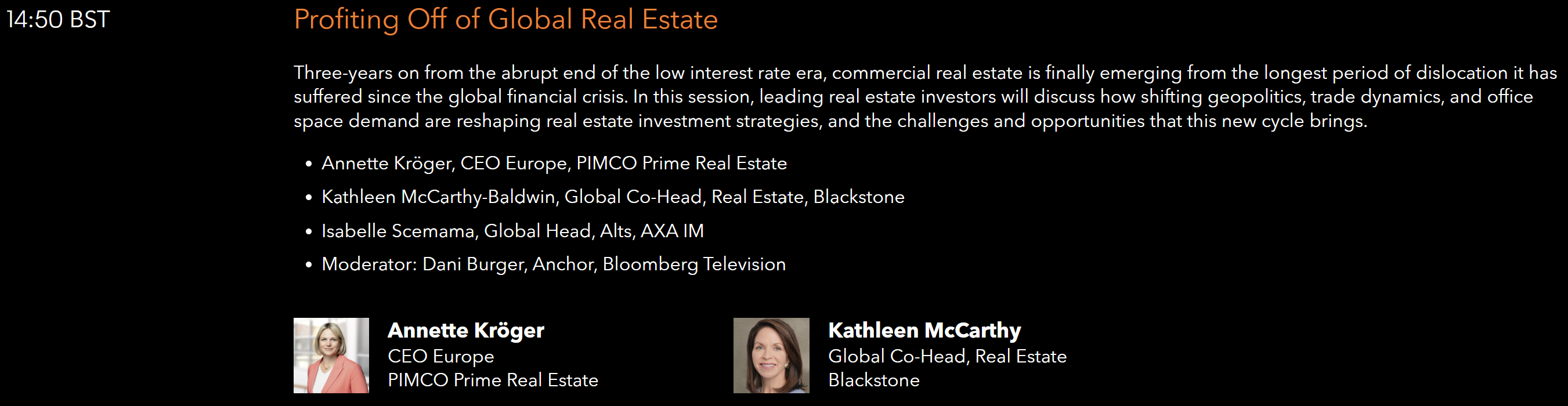 Annette Kröger, CEO Europe, PIMCO Prime Real Estate; Kathleen McCarthy-Baldwin, Global Co-Head, Real Estate, Blackstone; and Isabelle Scemama, Global Head, Alts, AXA IM discuss how shifting geopolitics, trade dynamics, and office space demand are reshaping real estate investment strategies with Bloomberg's Dani Burger