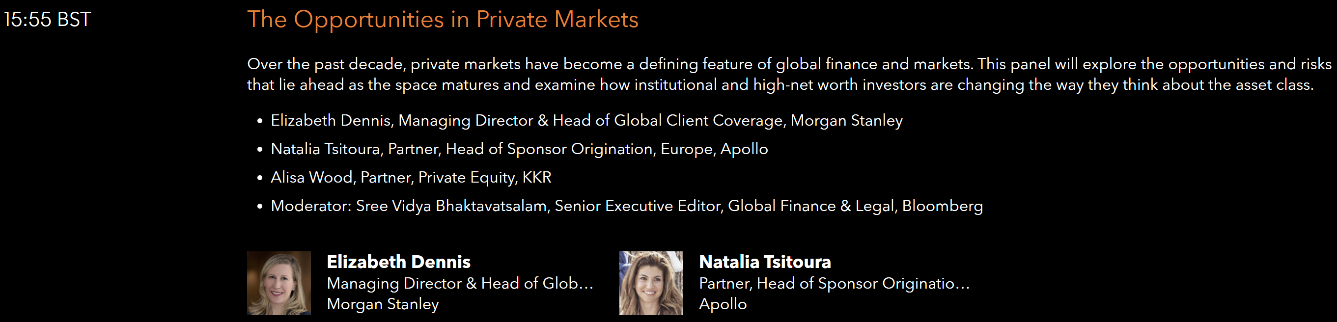 As autumn begins, schoolyards fill up and Q3 closes, so too does the finance conference circuit pick up pace. This week I attended Bloomberg’s “Women, Money & Power 2025” event in London, and the conversations were as weighty as the title suggests. In a world where capital is being redeployed at an unprecedented scale, women now control a growing share of wealth, influencing more key financial decisions than ever before. More than anything, I was thrilled to see the sheer amount of women's representation in the C-suite across these various powerful financial and technological platforms.