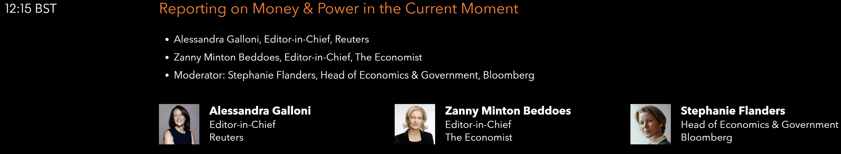 Alessandra Galloni, Editor-in-Chief, Reuters and Zanny Minton Beddoes, Editor-in-Chief, The Economist discuss how journalists are covering money and power in the current moment with Bloomberg's Stephanie Flanders.