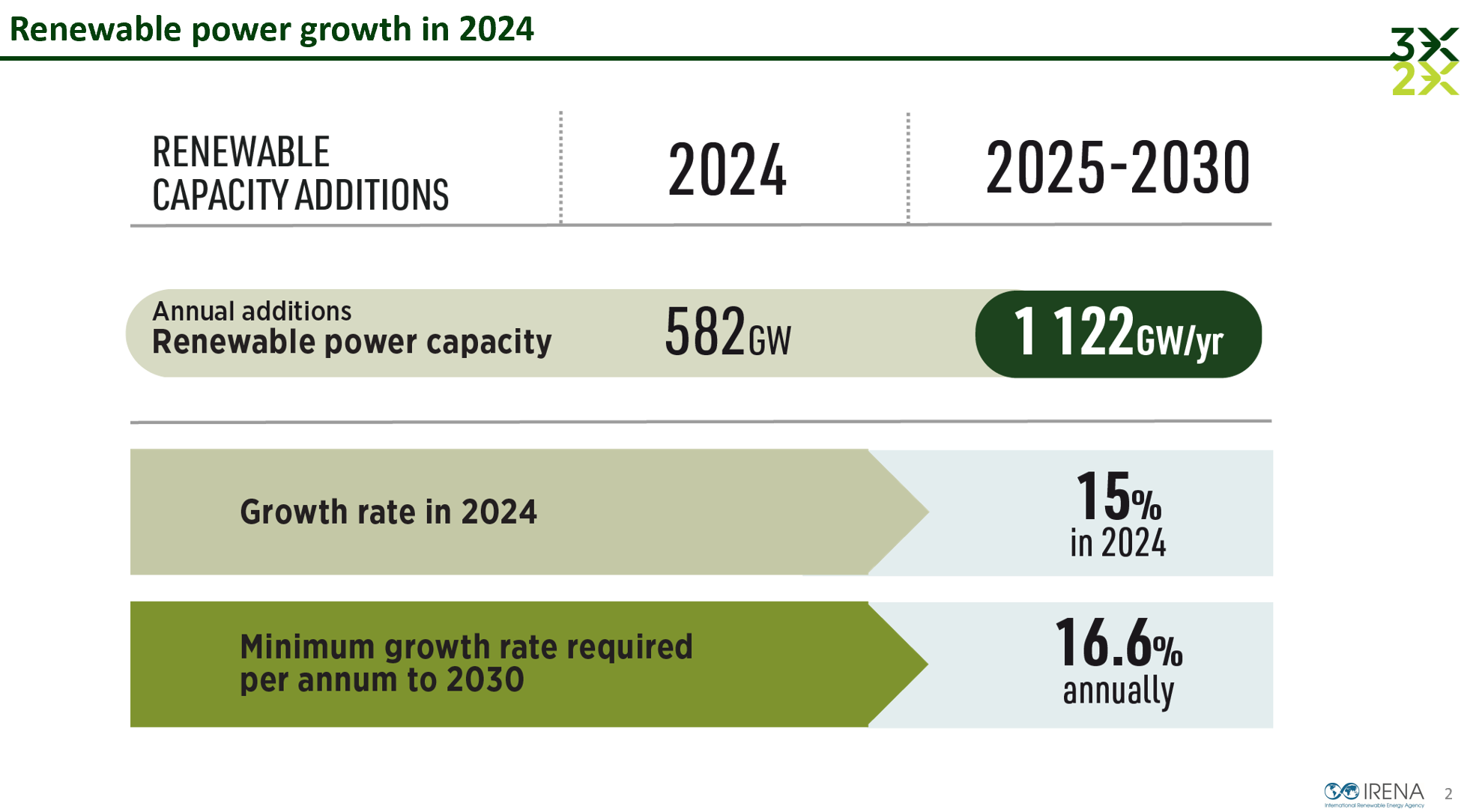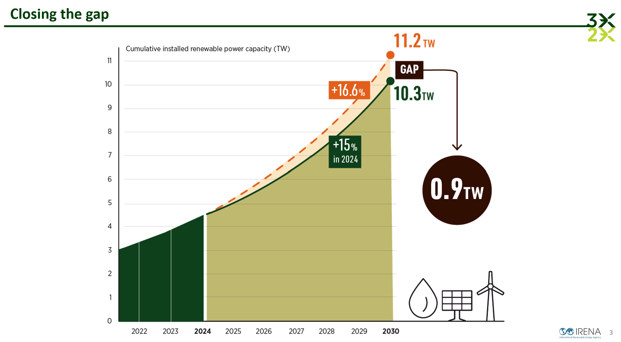 The global deployment of renewable power continues to accelerate, setting a new record with 581.9 GW of new capacity added in 2024. However, this progress falls short of the pace required to meet the 2030 tripling goal. To achieve the target of 11.2 TW, an average of 1,122 GW must be added annually between 2025 and 2030. If the current growth rate persists, the world is projected to fall short by 0.9 TW, a gap equivalent to the entire installed renewable capacity of North, Central and South America, and the Caribbean, combined.