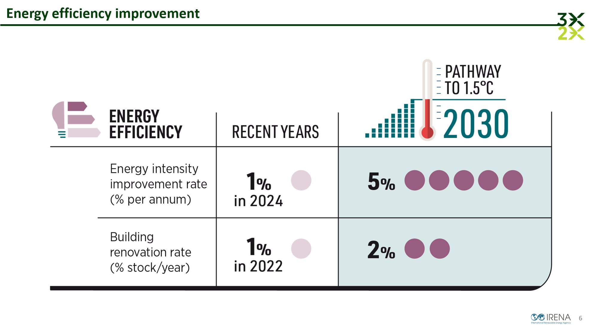 - The world is off-track: Despite record growth in renewable power in 2024, particularly solar, the report highlights that the pace is still insufficient to meet the 2030 targets, especially regarding the negligible progress in energy efficiency improvements. Renewable capacity must triple by 2030 (to ~11,000 GW), but current deployment (~473 GW/year) covers less than half the required annual pace. The energy efficiency rate is at 1% vs. 4% required per annum.